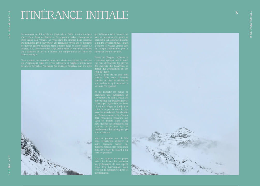 La montagne se finit après les gorges de la Daille, là où les nuages s’accrochent dans les falaises et les gipaètes barbus s’attaquent à leurs proies des rochers. Les yeux dans les jumelles nous scrutons les montagnes pour apercevoir leur habitants cornés qui se targuent de trouver encore quelques brins d’herbe dans ce désert blanc. Le blizzard s’écrase contre nos corps emmitouflés de vêtements chauds qui s’adaptent au fur et à mesure aux températures de l’hiver de haute montagne. Nous sommes ces nomades modernes vivant au rythme des saisons qui s’implantent dans ces terres déboisées et peuplées uniquement de neiges éternelles. Au matin des journées écourtées par les nuits qui s’allongent nous prenons nos sacs et parcourons les pistes de ski jusqu’à la poudreuse qui signe la fin des terrains balisés. Lancés à travers les vallées vierges vers les refuges abandonnés pour y séjourner durant une nuit. Peaux de phoques, raquettes et crampons, quelque soit le matériel nous découvrons des pierres, des chamois, des lagopèdes, au détour des grondement du torrent de l’Isère. Gare à nous de ne pas nous perdre dans cette immensité blanche ou bien de déclencher une avalanche qui dérobera le sol sous nos spatules. Je me rappelle les pentes silencieuses des montagnes du Mercantour, où seul le fracas des pierres émis par les caprins brise la paix qui règne dans ces lieux. Là où les refuges se fondent au point de se perdre dans le paysage, les marcheurs des chemins se côtoient comme si ils s’étaient déjà rencontrés plusieurs fois. Voilà le monde dans lequel nous traçons nos premières empreintes, en discutant avec les randonneurs des montagnes que nous explorons. Mais au premier jour de l’été nous repartirons explorer un autre territoire habité par d’autres espèces que nous attendons de croiser du regard à travers les jumelles. Voici le contenu de ce projet, suivre les lettres, les panneaux, les griffonnages de nos expéditions. Une typographie inspirée par la montagne et pour les montagnards.