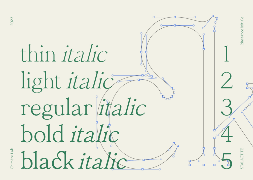 La typographie Stalactite est une police de caractère qui contient 234 glyphes, elle est inspirée par la nature, par les éléments organiques que l’on retrouve sur les lignes de la roche. Tout ces types de roches que l’on retrouve quand on marche le long des sentiers de randonnées, dans le Mercantour, les Ecrins et la Vanoise.